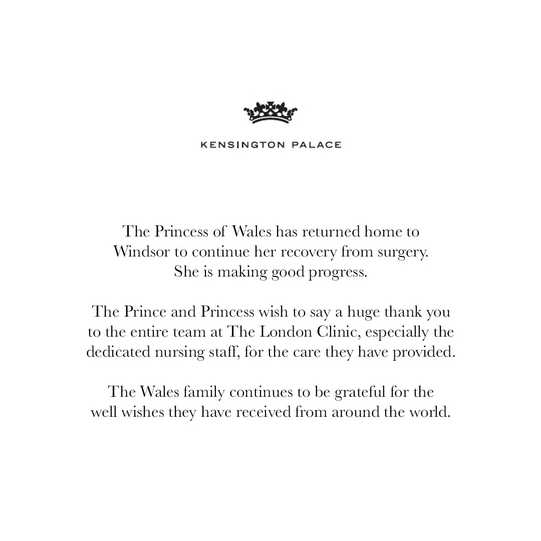 Вот. Как я и писала буквально вчера. В то время, как ситуацию с Чарльзом не держат в секрете и Камилла на глазах у всех приезжает по несколько раз в день к мужу, болезнь Кэтрин и ее причины пока держат в максимальном секрете. На днях как раз подходило к концу время пребывания Кэтрин в больнице, ведь в объявлении говорилось о 2 неделях. Я предполагала, что выписка, как и госпитализация принцессы пройдет так тихо и приватно, что никто не узнает и не увидит. И оказалась права. Сегодня совсем недавно Кенсингтонский дворец выпустил объявление о том, что принцесса Уэльская была выписана из больницы: Принцесса Уэльская вернулась домой в Виндзор, чтобы продолжить восстанавливаться после операции. Процесс выздоровления продвигается успешно.