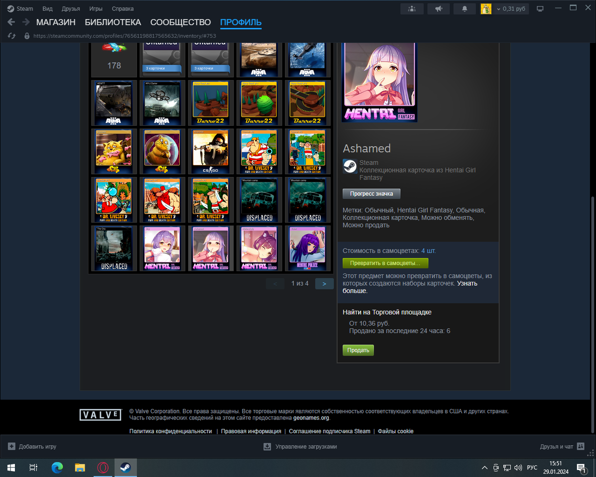На днях купил игру по скидке, всего за 21р Hentai Girl Fantasy. После чего решил узнать стоимость карточек на торговой площадке, сумма денег с 3 карт составила 30р. Карты будут постепенно подниматься в цене. Через год- 2 стоимость карт возможно поднимется до 50-70р.