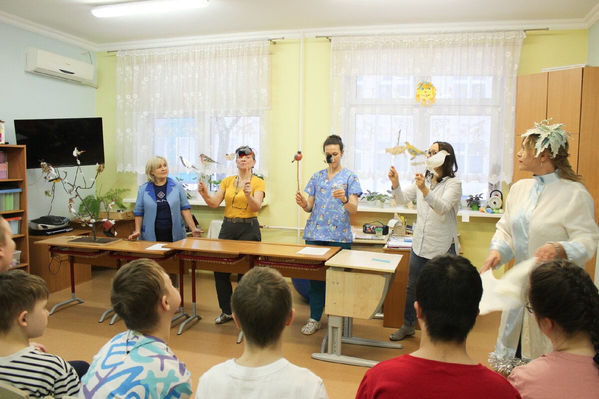 Зима – непростое время года для птиц, потому что с наступлением холодов им тяжелее найти питание. Воспитанники особого семейного центра «Роза ветров» отправились путешествовать в мир зимующих птиц, чтобы внести свой вклад в помощь пернатым. На занятии педагоги театрализовали сказку о пернатых друзьях и рассказали детям, какие птицы остаются зимовать, почему нужно помогать им в это время года и чем их можно подкармливать. В одном лесу жило много прекрасных птиц. Однажды волшебница - Зима принесла с собой снег и морозы. Холодно стало птичкам и стали они думать, что делать дальше. Жаворонки и соловьи предлагали улететь в теплые края. Снегири и синицы предлагали остаться и перелететь поближе к добрым людям. Долго птицы спорили, но так и не смогли договориться между собой. Загрустили птички, холодно им, ягод и семян совсем не осталось. Летали птички голодные, как вдруг увидели на дереве висящий маленький домик. Птички решили туда заглянуть, а там еды видимо-невидимо. Обрадовались они и н