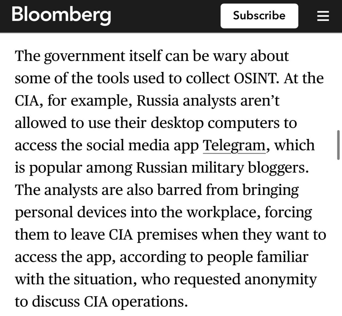 Аналитикам ЦРУ, занимающимся российской тематикой, не разрешают запускать Telegram на компьютерах в офисе, — Bloomberg 28 января 2024 года Bloomberg сообщил, что аналитикам ЦРУ, занимающимся российской тематикой, запрещено запускать Telegram на компьютерах в офисе. Telegram — это популярный мессенджер, который известен своей анонимностью и безопасностью. Он также является популярным инструментом для распространения дезинформации и пропаганды. По данным Bloomberg, запрет на использование Telegram в ЦРУ был введен в прошлом году. Причина запрета заключается в том, что ЦРУ опасается, что Telegram может быть использован российскими спецслужбами для слежки за аналитиками или для распространения дезинформации. Запрет на использование Telegram в ЦРУ вызвал неоднозначную реакцию. Некоторые аналитики считают, что запрет является чрезмерным и ограничивает их свободу общения. Другие аналитики считают, что запрет является оправданным, учитывая риски, связанные с использованием Telegram. Возможные