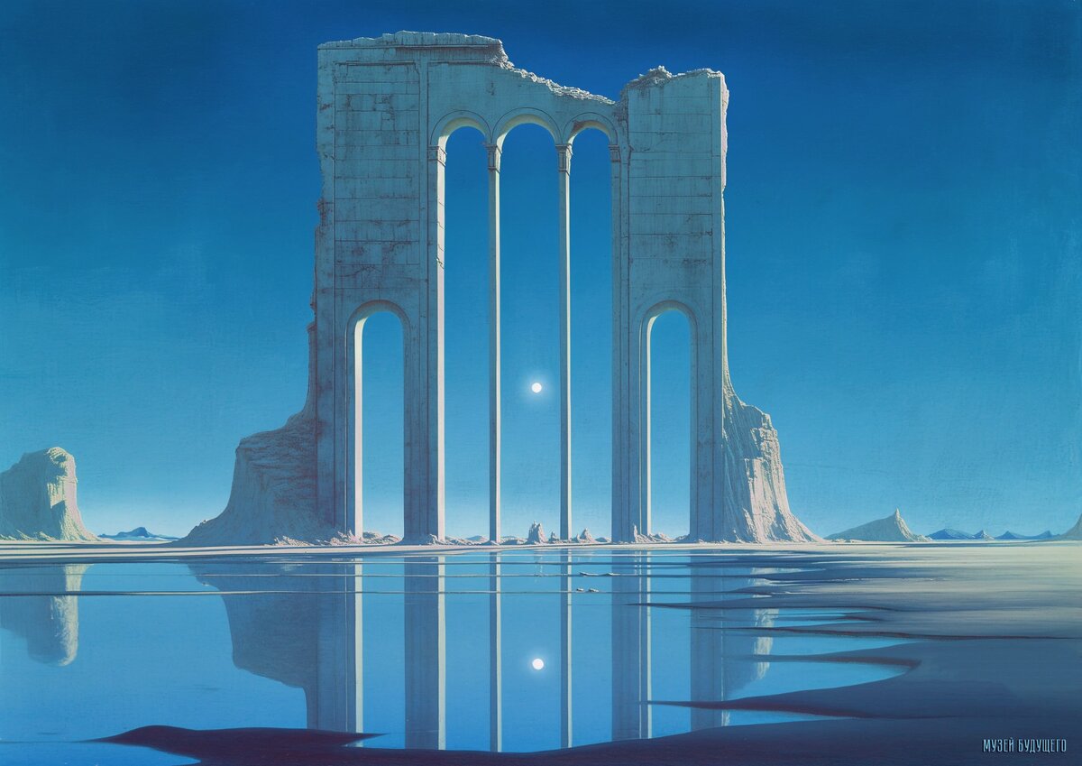 Спустя тысячу лет мы снова пришли к Проходу. Вечерние лучи Cолнца рассыпались по уставшим камням и воздушным аркам, оттенив трещины и сколы. Призрачная тень большой луны зависла в середине центрального свода. Наступила середина лета. Я помню, как в этот день сюда приезжали со всей планеты - на песчаных кораблях под серебристыми парусами, на изящных лодках по извилистым каналам, верхом на многоногих животных, даже приходили пешком, чтобы услышать древнюю музыку, созданную для трёх высоких арок. Но где теперь музыка, где праздничная толпа? И лето - где? Проход между Долиной теней и Великой пустыней разрушен, колонны день за днём разрушает ветер времени. Планета замерзает и ржавеет. Моря испаряются. Города медленно но неотвратимо тонут в песках. Когда я снова приду сюда, останется хоть что-то от колонн и арок? И я - всё ещё останусь собой? ________________________ Картина - трибьют художнику Майклу Уэлану, история - писателю Рэю Брэдбери. Изображение создано с помощью Midjourney, исправле