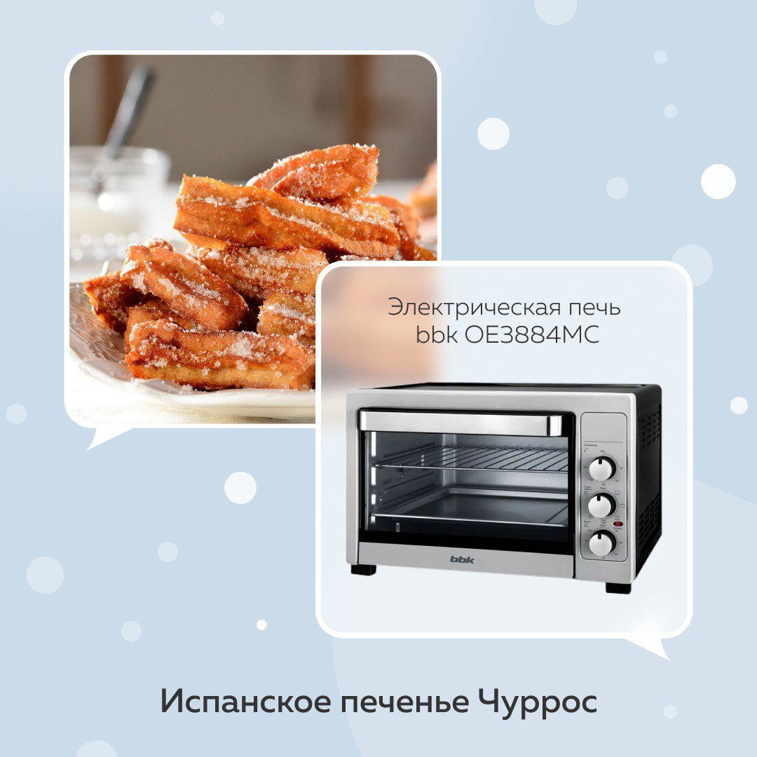 Хотите порадовать гостей вкусным десертом? Как на счет испанского печенья Чуррос, которые не оставит ни вас, ни гостей без вкусовых впечатлений? Для начала растопите 100 г сливочного масла в 250 мл воды на небольшом огне. Помешивайте и понемногу подсыпайте 150 г пшеничной муки. Тесто должно получиться гладким. Даем ему немного остыть, вводим в него 2 яйца и интенсивно перемешиваем. Добавьте 60 г сахара, хорошенько перемешайте и переложите полученное тесто в кондитерский мешок. На противень с пергаментом выдавить тесто и отправить в разогретую до 200 градусов электрическую печь bbk OE3884MC на 10-15 минут. Готовые печенья обваляйте в смеси сахара и корицы. Приятного аппетита! Приобрести печь bbk OE3884MC можно в нашем магазине на OZON