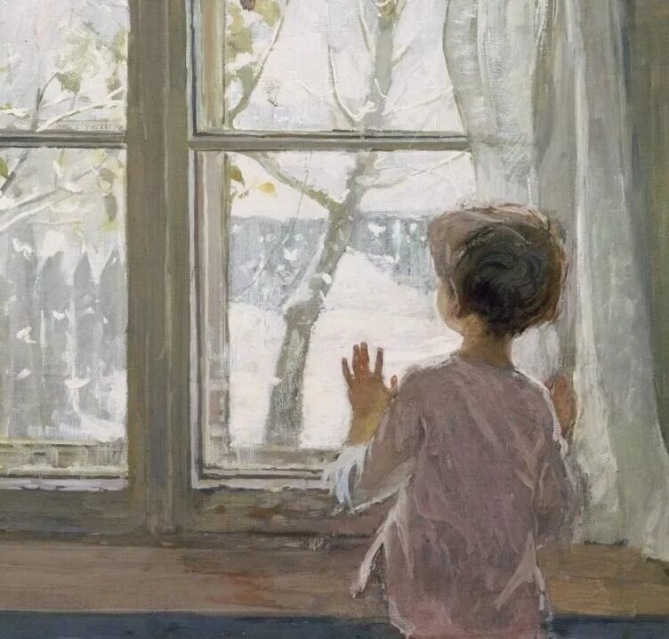 На картине изображён мальчик. Он внимательно смотрит в окно, прижавшись ладошками к холодному стеклу. Малыш только что проснулся. Он стоит в одной рубашке, его волосы взъерошены. За окном кружатся снежные хлопья, похожие на лебяжий пух. Кое-где на деревьях видны последние осенние листочки. Снегом украшен весь двор! Мальчику не терпится выбежать на улицу и повеселиться. Я бы с удовольствием поиграла с ним в снежки!