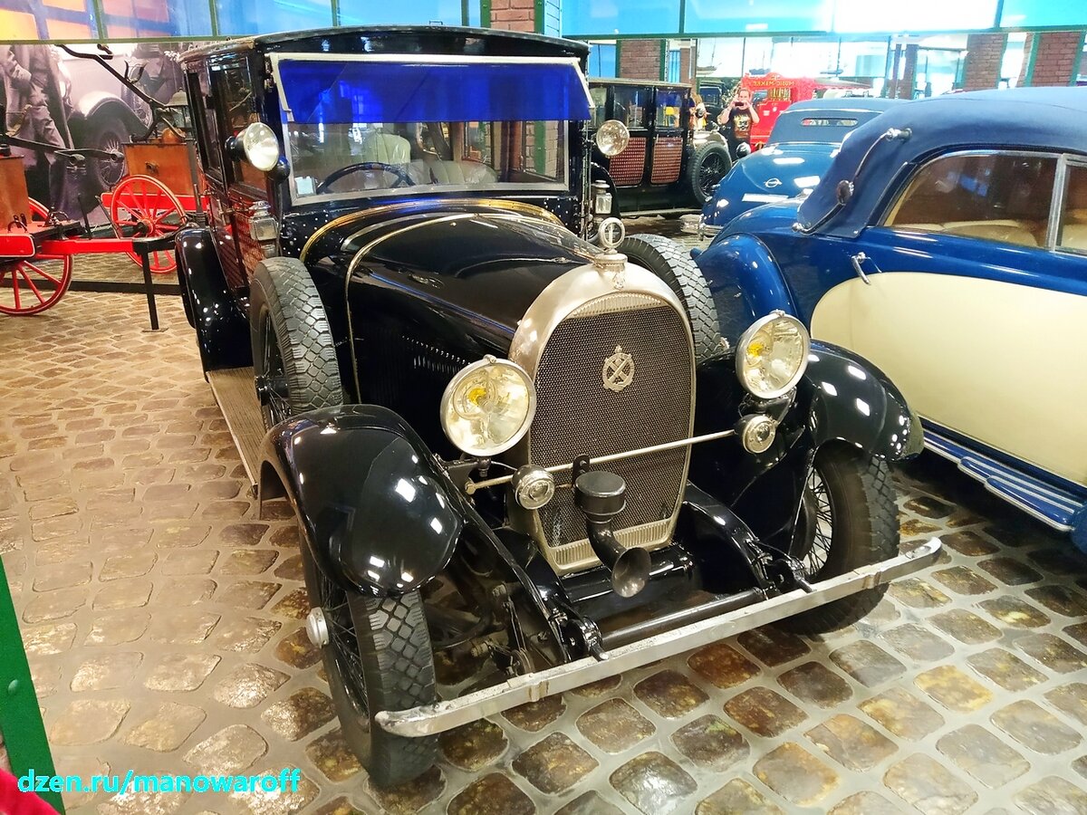 С историей разобрались, перейдем к автомобилю (правда, инфы по нему практически нет - в основном только то, что написано на табличке в музее). Люксовая машина (как, практически, и все остальные модели фирмы) появилась на свет в 1926 году и стала лучшей довоенной моделью компании. Кузов типа Berlina de Voyage демонстрирует всю роскошь той эпохи - отделенный причудливо изогнутой в стиле Art Deco стеклянной перегородкой пассажирский салон, прячущиеся под обивкой стен потайные карманы и даже вазочки для цветов на кузовных стойках в салоне. Дорого-богато.