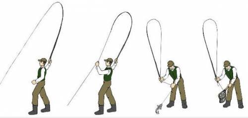 Также не забывайте, что остановка удилища в точках А, В, 1 и 2 должна быть внезапной, чтобы загрузить кончик удилища и передать энергию шнуру и броску. И при броске, после остановки, постарайтесь более мягко опустить удилище для более деликатной презентации. Вываживание рыбы. Теперь самая весёлая часть, как вытянуть «хорошую» рыбу? Некоторые рыбаки спрашивают: «Как можно вытянуть рыбу без катушки?» А подумайте, как вы вытягиваете рыбу даже с катушкой. Вы же не подматываете её прямо к себе. Вы подымаете удилище вверх и приближаете к себе рыбу, далее перехватываете шнур и потом рыбу. Но помните шнур такой же по длине, как и удилище, или немного длиннее (чем длиннее шнур, тем сложнее вытянуть рыбу). Следующая картинка иллюстрирует, как вытягивать рыбу, если шнур длиннее удилища. Если же шнур короче, обычно рыбу можно просто схватить рукой. Сборка снасти Возможно, покажется странным, что я начинаю со складывания удилища, не рассмотрев его подготовку к ловле, в первую очередь. Всё потому ч