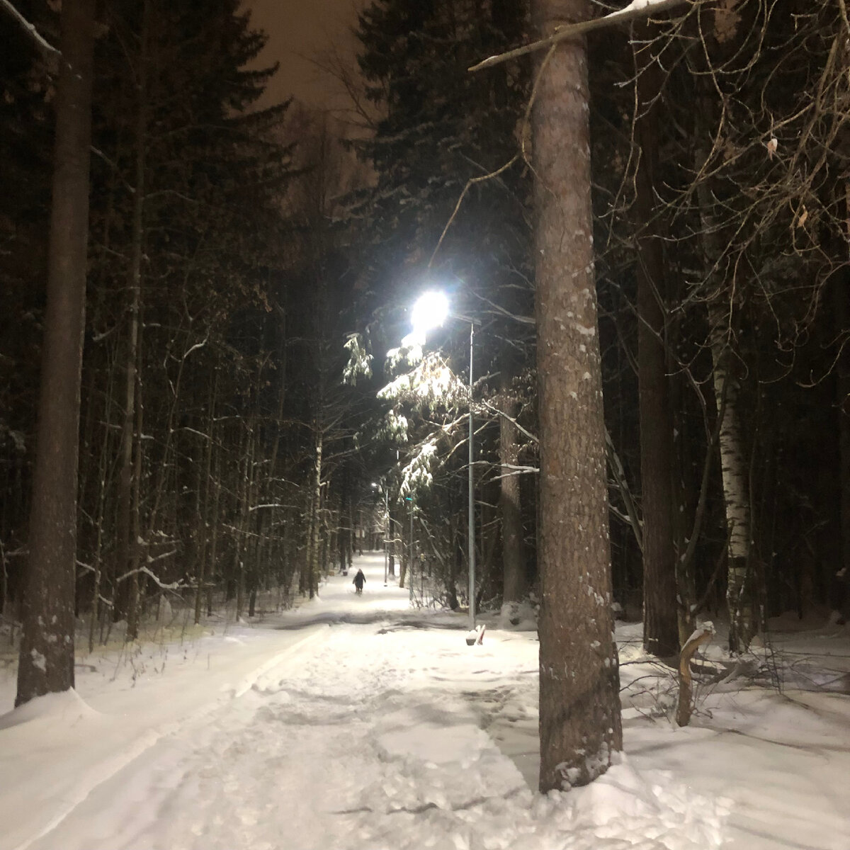 Когда погода располагает - приятно вечером в будний день погулять по парку! Когда слышен только хруст снега под тяжестью шагов и хруст снега редких прохожих. Тишина и гармония хрустящего снега, легкого ветерка способствуют релаксу - душевному отдыху и равновесию наедине с природой! Гуляем мимо сосен, глубоко вдыхаем хвойный запах смолы, шишек. Позвольте организму расслабиться и настроиться на ритм окружающей природы. Понаблюдайте за игрой, вальсом в ритме падающих снежинок при свете фонаря! Это капли дождя, только в другом состоянии. Так постепенно капля за каплей растут сугробы. Каждый маленький шаг - это вклад в что-то грандиозное, уверенность и новые шаги приближают успех, конечный результат! Человек - песчинка в огромной Вселенной, но вся Вселенная способствует осуществлению желания, в которое он верит! Все настолько гармонично и работает по внутреннему ритму, каждый кирпичик мироздания как и эти снежинки, кружащие в вальс! Прогуляемся до ближайшей лавочки, поставим рюкзак и дос