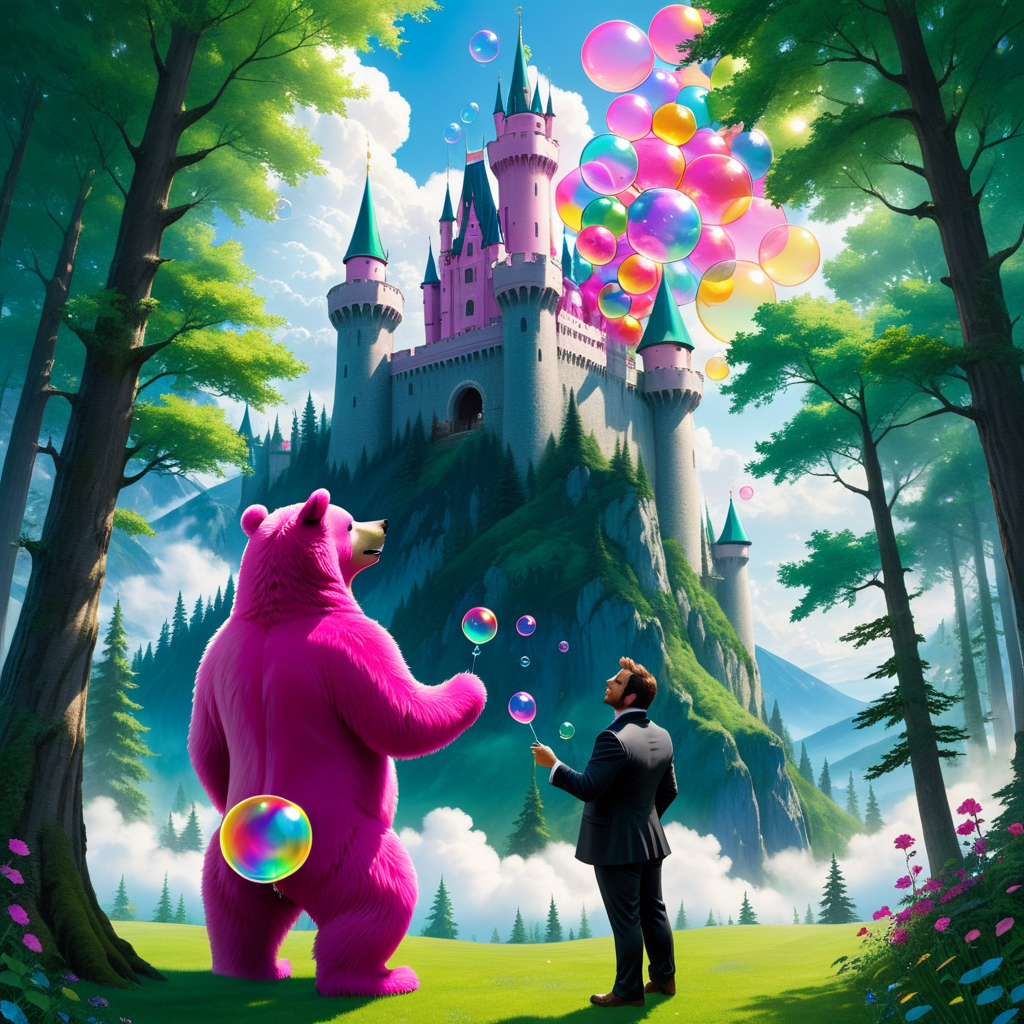 Однажды медведь и мужик встретились на лесной поляне. Медведь был ярко-розовым и пел по-итальянски "Volare", а мужик был зеленой травяной тонкостебельной живой статуей. Они решили провести время вместе и отправились в замок из разноцветных пузырей, который стоял на краю облака.