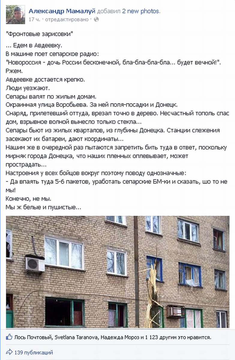 «Пишет на своей страничке в Фейсбуке один из доблестных бойцов АТО: