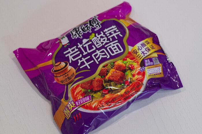Продолжая линейку вкусов лапши, забыл упомянуть в опросниках про этот вкус. По моему мнению самый запоминающийся и вкусный. Хоть аромат квашеных овощей не вызывает обильное слюноотделение, но попробовать этот вкус стоит однозначно. Пакетик приобрёл всё в том же местном магазинчике за 100 рублей. Начнем с внешнего вида упаковочки. Упаковка выглядит весьма привлекательно. Яркая, фиолетовая плюс традиционный бочонок для хранения и заквашивания продуктов изображен, что как бы отсылает нас к вкусу лапши. Комплект уже всем знаком. Комплект уже традиционный, сухая суповая основа, концентрированный бульон и в отличие от остальных вкусов, имеется пакетик с квашенными овощами. В своем составе основа имеет вкрапления сухих овощей и соевых кусочков "говядины". Соус, имеет приятный оранжевый цвет, на вкус соленый, островато-кисловатый. Выдавливается легко. Следом на лапшу летят те самые, квашенные овощи. Пакетик открывается легко. Если вы не "стрелянный" по китайской лапше, аромат может слегка смут