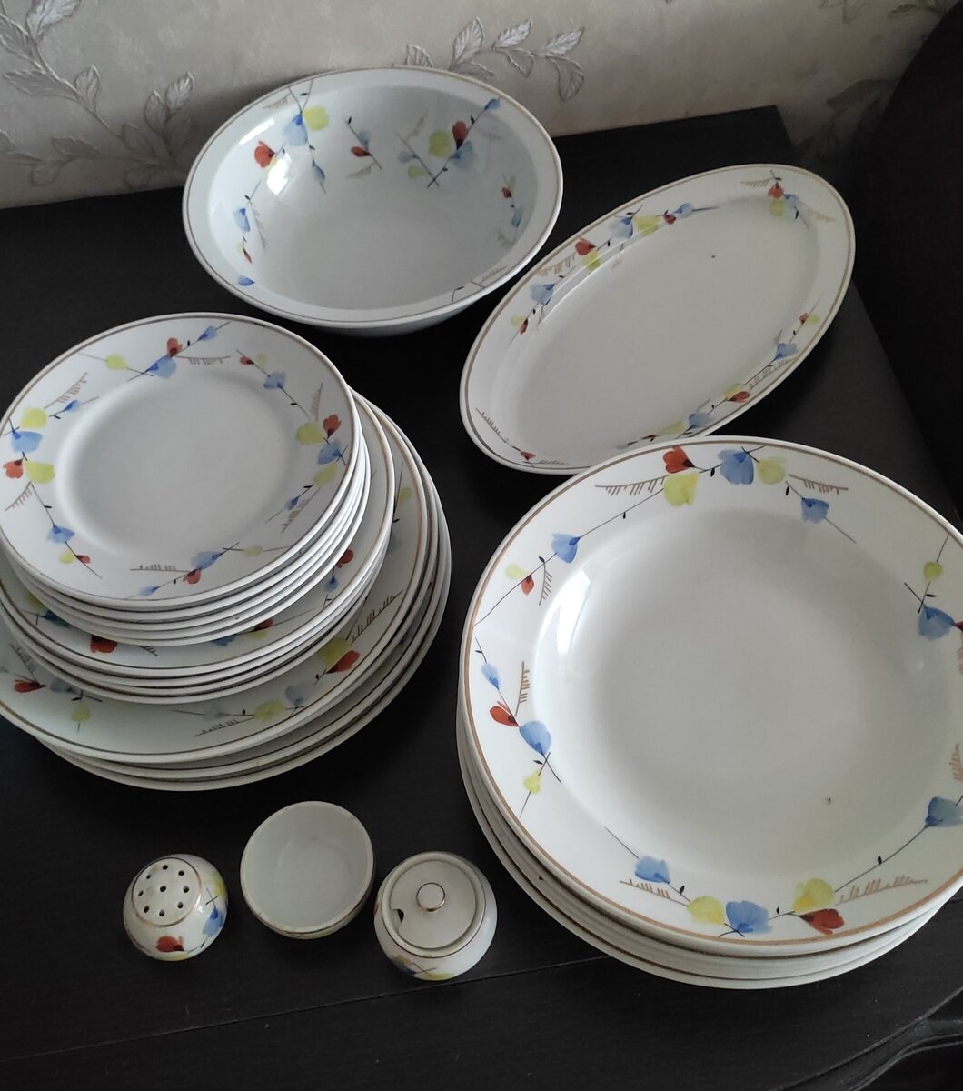 На даче на праздничном столе у меня обычно тарелочки с гусями, а в квартире другой сервиз, особенный. Сколько себя помню, всегда он. Сначала у бабушки, потом у мамы, а потом и ко мне перешёл.В нашей семье его очень хранили и почитали, доставали по особым праздникам, но я никогда не задумывалась откуда он. А сейчас, когда я стала интересоваться семейными реликвиями, у мамы узнала, что он был подарен моей бабушке на производстве, за добросовестный труд в 60-х годах, за что именно мама не помнит, была ещё ребёнком. К слову сказать, человеком бабуля была не простым, одна из лучших на фабрике, депутатом, награждена Орденом Ленина. Сегодня рассмотрела клеймо. Завод "Пролетарий", до 1922 года Бронницкая фарфоровая фабрика.Такое клеймо ставилось в 1958-1967 годах. Простая и лаконичная ручная роспись крупными мазками не поблекла со временем. Цветочный рисунок декорирован золотом. Сервиз на 6 персон, подстановочные, закусочные, десертные и глубокие тарелочки, салатник Большая селедочница И