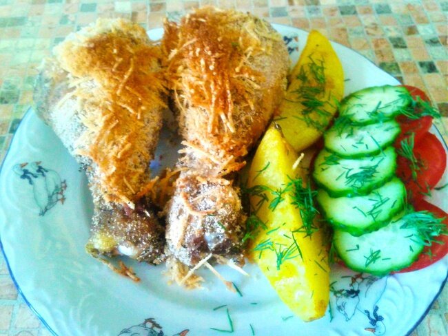 Куриные голени в панировке, запеченные в духовке с картофелем.