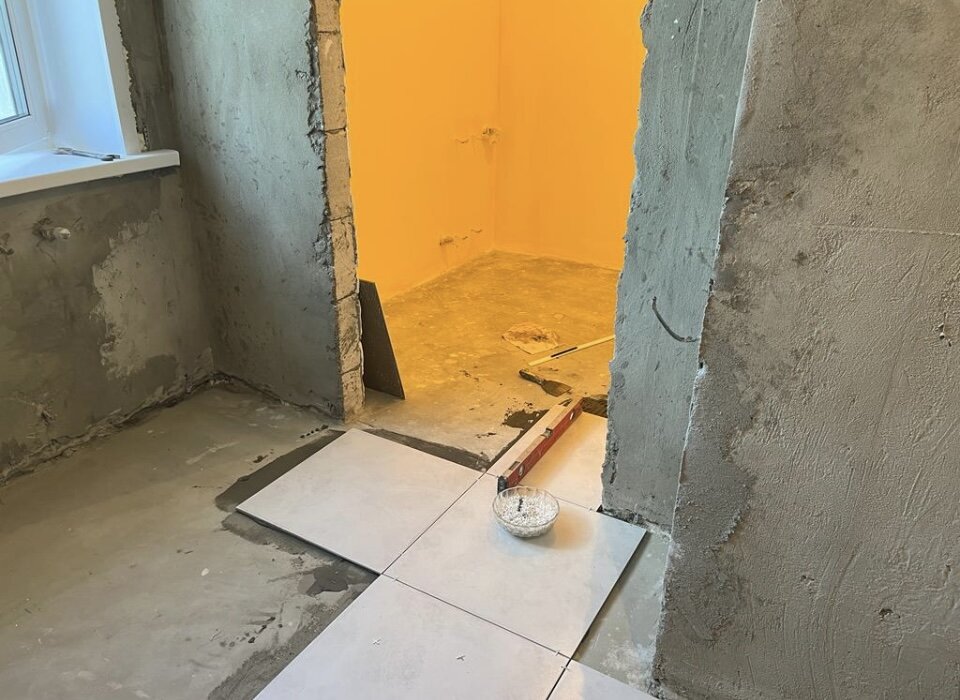 Ванная комната на втором этаже у нас получилась очень просторной, да ещё и с окном. Раньше здесь была комната Г-образной формы. Ничего лучшего мы не придумали, как сделать ванную комнату и кладовку. Получилось очень даже неплохо. Полы мы выложили серым керамогранитом, тем же, что в душевой комнате и в туалете первого этажа. Стены в кладовой выкрасили в жёлтый цвет, как в летней кухня и в котельной. А стены в ванной комнате выложили плиткой. Такой рисунок, на одной стене, нам нарисовали в магазине на компьютере из плитки, которая нам понравилась. Молодец продавец-консультант, она ещё по образованию дизайнер. В реальности получилось ещё лучше, ярче. Работали те же узбеки, что и на первом этаже. Так же не обошлось без переделок. Полы выкладывал зам. бригадира, к которому у меня претензий нет, как и в других помещениях. А вот стены выкладывали двое: бригадир и член бригады, которые везде ошибались и до этого. Хорошо, что я всегда рядом. Увидела несколько «косяков». А то бы пришлось всю