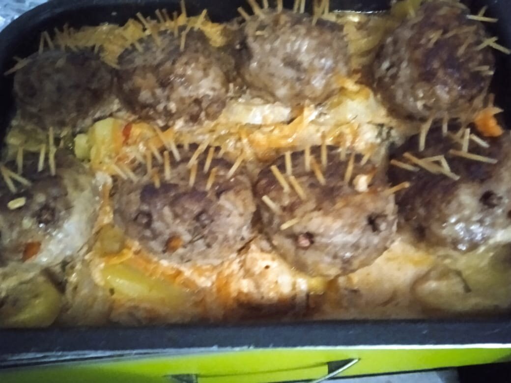 РЕЦЕПТ ТЕФТЕЛИ ЕЖИКИ мама в детстве на день рождения такие готовила.Сейчас будем готовить тефтели ежики. Берем фарш желательно смешанный,добавляем специи соль,перчик,приправу кориандр,лучок,чеснок и все перемешиваем.Далее отвариваем рис в подсоленной водичке даем остыть,перемешиваем с фаршем даем постоять.Пробуем добавляем,что не хватает.И делаем тефтели,далее чуть -чуть обжариваем на подсолнечном масле,даем остыть и делаем из них ежиков. Глазки делаем из гвоздик,иголочки делаем из мелкой вермишели, а носик вырезаем из морковочки.Все готово.Нарезаем кругляшками картошечку,лучок.Делаем соус две ложки сметаны,две ложки майонеза,томат пасту две ложечки,стакан воды,зелень. Теперь смазываем формочку маслом подсолнечным,укладываем картошечку,наверх лучок,солим и заливаем соусом, а наверх кладем свои красивые тефтельки.И ставим в духовку на 180 градусов. Накроем сначала все это фольгой,чтобы не сгорела вермишелька.Готовим до готовности и далее за две минуты снять фольгу,чтобы вермишелька зар