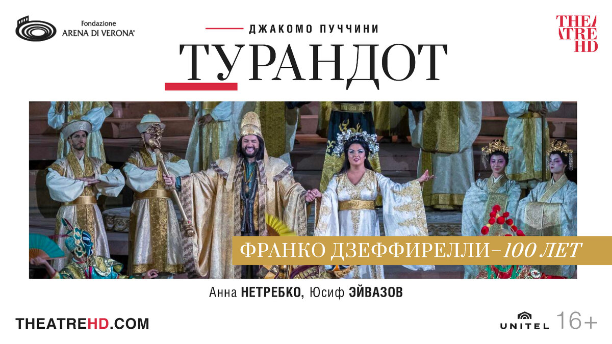 Возрастное ограничение 16+ Жанр Опера Хронометраж 149 мин. Легендарная музыкальная драма в сказочных декорациях Легендарный классический спектакль Франко Дзеффирелли с участием мировых звёзд - блистательной Анны Нетребко и Юсифа Эйвазова – с истинно кинематографическим размахом воплощает великую оперу Пуччини. Арена ди Верона чествует итальянского кино- и театрального режиссёра Франко Дзеффирелли и его легендарную постановку «Турандот». Эпический и очень кинематографичный спектакль воспроизводит великолепие императорского Китая впечатляющей сценографией, дополненной роскошными костюмами японской художницы Эми Вада, лауреатки премии «Оскар». Безупречна и атмосфера таинственности: в доме-дворец роковой принцессы всем грозит смертельная опасность. Ответ и спасение – в любви, что растапливает ледяное сердце Турандот. «Нетребко не просто поёт свою партию, она проживает её. Её Турандот – человечная и правдивая героиня; в опере такое случается нечасто». (La Stampa) Режиссер Актеры Анна