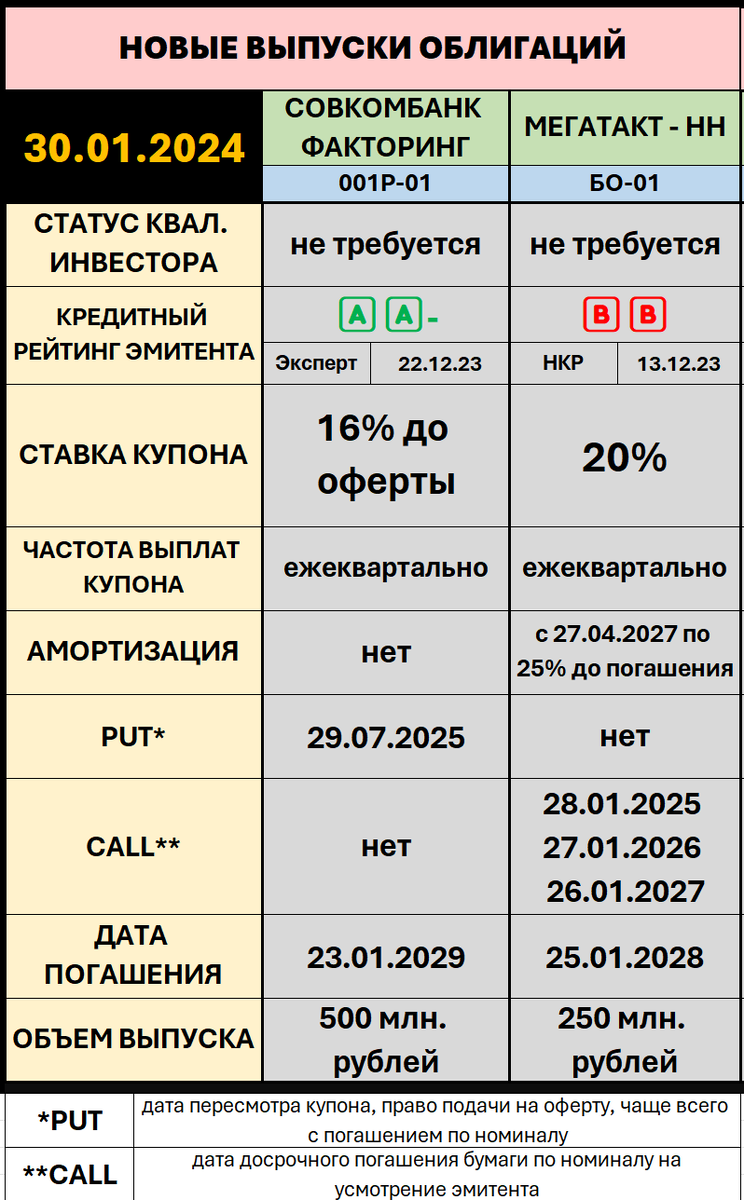 🛠 Утро вторника приветствует вас, дорогие читатели! Пара новых выпусков стартует сегодня - с удовольствие поделюсь новыми лицами - ведь оба эмитента представляют свои дебютные выпуски! 1️⃣ СОВКОМБАНК - ФАКТОРИНГ запутал всех, кого только можно. Сначала ориентир купона снижали до сбора, по итогам сбора значение увеличили до первоначального максимума, при этом заявки, как я понял, закроют не в полном объеме. Зачем все это было сделано? Ответ в рубрике "необоснованные предположения" - вероятно, в выпуск собрался кто-то крупный и влиятельный, сумевший заявить эмитенту в глаза о том, что ниже купона в 16% не пойдет! Другой здравой версии я придумать не смог, пусть происходящее будет на совести закулисных биржевых игр. ▶️ Кажется, самый крупный факторинг среди биржевых. Гордо именует себя пионером российского рынка подобной направленности, работает с 1999 года. Работает с производителями и поставщиками всех групп товаром, но, собственно, кто с ними не работает :) Представляют себя как ув