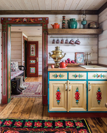 Интерьер в русском стиле — это всегда интересное решение, которое помогает дому приобрести индивидуальность, неповторимую атмосферу. Увы, сейчас к этому стилю обращаются не так часто, но все же есть примеры, где современность встречается с историей, функциональность и стиль — с традициями предков. Сегодня мы покажем и расскажем вам об одном таком доме. Кто знает, может этот пример вдохновит вас на создание своей современной русской избы. Сразу скажем: оформление в русском стиле — это не одни только матрешки, баранки, самовары и балалайки. Все гораздо более разнообразно. И убедиться в этом нам поможет дом, который хозяева ласково называют «Пирожком» — он очень компактный, но при этом начинки много! Дизайнером стала Мария Курденевич. Дом этот вырос на месте старой постройки, которую полностью разобрали, оставив только матушку-печь. Затем дом «собрали» заново, сохранив при этом прежнюю планировку и пропорции. Так, внутри можно увидеть просторную прихожую, кухню и спальню, а в мезонине — у