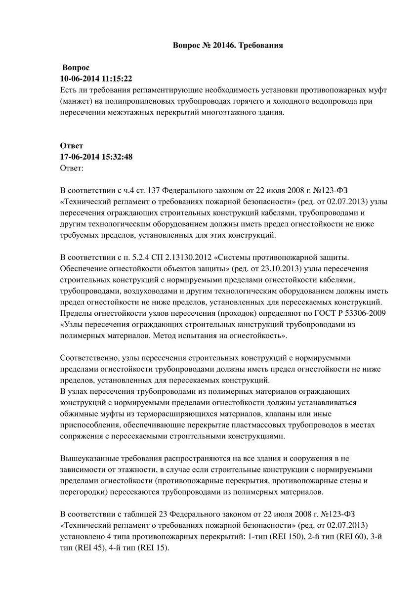 Необходимость установки противопожарных муфт на полимерных трубопроводах водопровода