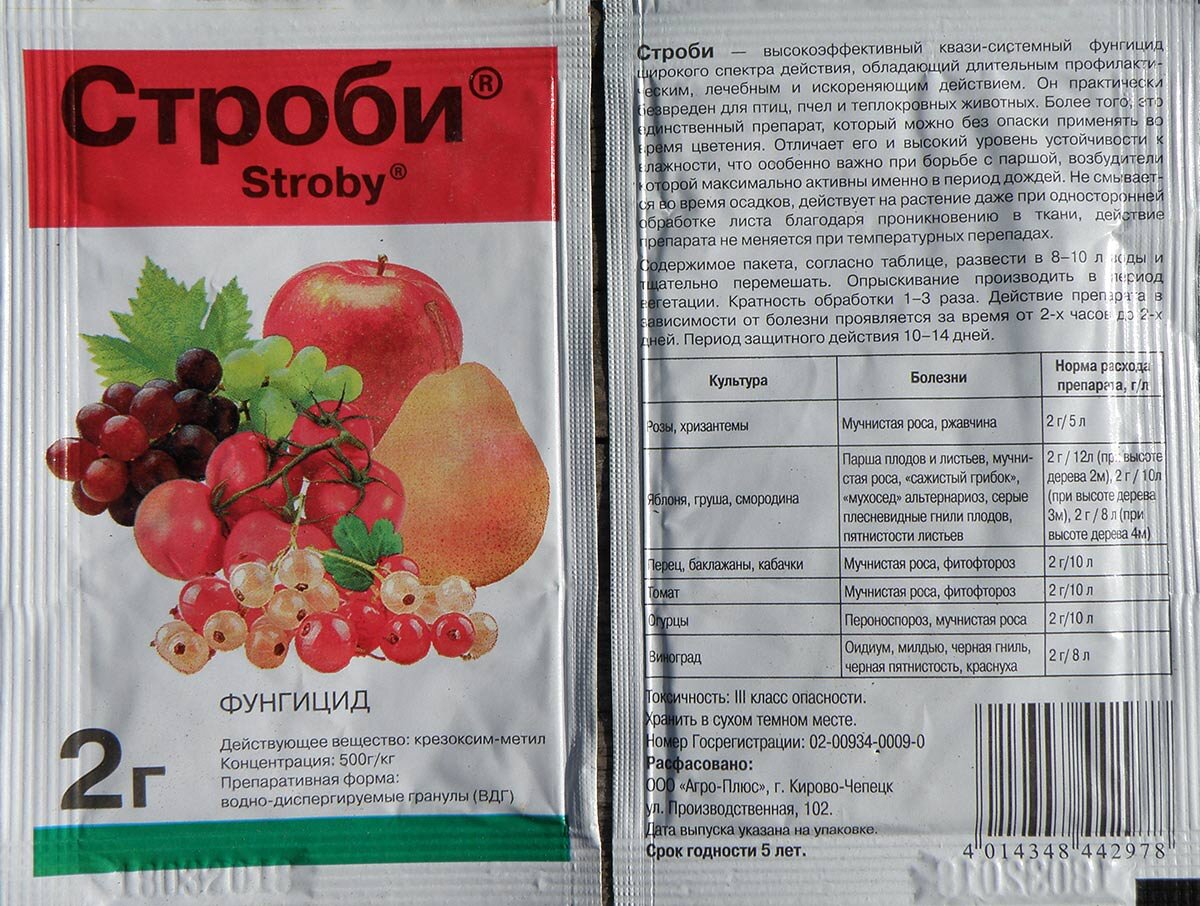 Строби – это препарат, который используется для лечения грибковых инфекций растений. Основное действующее вещество убивает различные виды грибков, включая мучнистую росу, черную пятнистость и другие. Строби может быть использован для обработки растений как в профилактических целях, так и для лечения уже существующих инфекций. Строби эффективно подавляет самые разные грибки. Такие как пероноспороз, мучнистая роса, парша, плодовая гниль, черная пятнистость, ржавчина, прикорневой рак, фитофтора и многие другие. То есть почти все болезни, что встречаются на растениях.