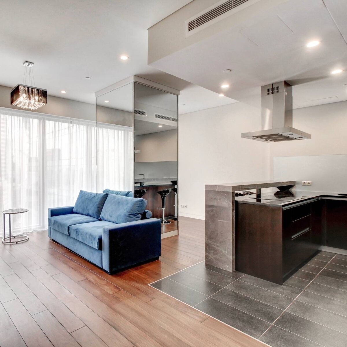 Что особенно удобно – в ОКО уже реализована полная отделка апартаментов и установлена бытовая и кухонная техника. Кстати, комплектация подобна работе куратора частной коллекции искусства – здесь собраны лишь по-настоящему премиальные бренды. Объединение гостиной и кухни стало трендом последнего десятилетия. У такого решения есть большое количество преимуществ.