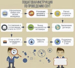 Затем выезжает специалист аккредитованной организации, который в зависимости от деятельности организации проводит необходимые мероприятия по оценке заявленных рабочих мест.