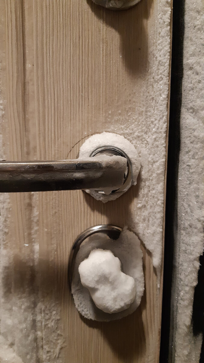 При планировании частного дома, задумайтесь сразу о входной двери. Обычные одинарные входные двери в мороз обмерзают, на них образуются конденсат и иней. К сожалению, мы при планировании не очень продумали этот момент, и получили в мороз снежную входную дверь, потому что наша дверь предназначена для теплого подъезда, а никак не для улицы. В небольшой минус на двери просто образуется конденсат, а вот при морозе покрепче, дверь покрывается инеем, а потом и слоем снега. Участвуют в этом флешмобе металлические детали, особенно ручка и замки. От чего же так происходит? Зимой температура в доме выше, чем на улице, соответственно из-за разницы температур в помещении и на улице в морозы на двери образуется конденсат, который в более сильный мороз превращается в иней или лед. Вспоминаем о точке росы - из-за нее и образуется конденсат. Например, при температуре воздуха в доме более 20 градусов, на двери достаточно и плюс 7 градусов, чтобы пар из воздуха превратился в воду. При достижении дверью