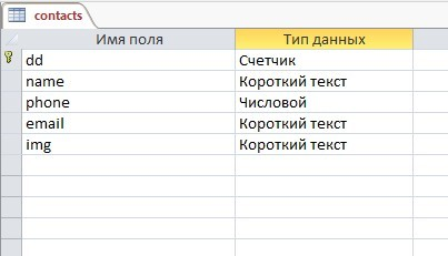 В качестве СУБД выберем программу Microsoft Access. Но вы можете использовать и другую базу данных.Создаем базу данных в Microsoft Access и называем её «test». В этой базе данных создаем таблицу «contacts»: