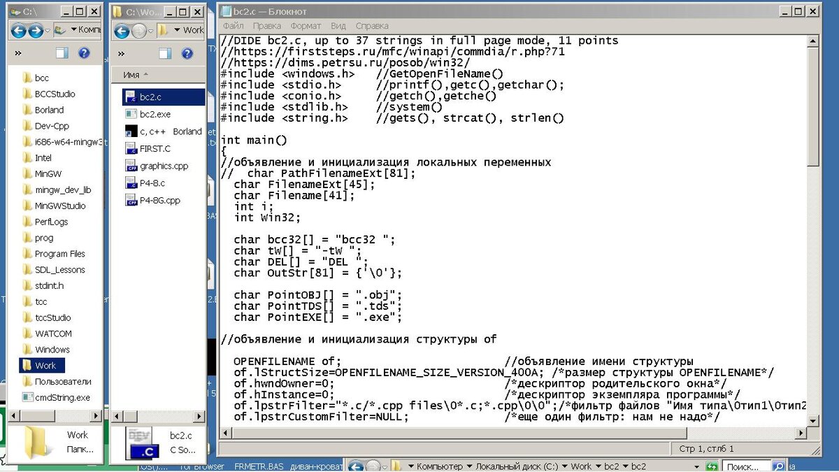 Изучающим языки С/C++ и другим пользователям только для проектов без файлов ресурсов предлагается совершенно забесплатное и забесплатное навсегда консольное приложение - простейшая дезинтегрированная среда разработки (DesIntegrated Development Environment, DIDE) bc2, в которой используется стандартный для Windows редактор текста Notepad (Блокнот) или любой другой удобный для пользователя редактор текста, совершенно забесплатный и забесплатный навсегда компилятор Borland С++ 5.5.1 for Win32 и стандартное для Windows одно, два или даже три окна стандартного проводника Windows для отображения каталогов.