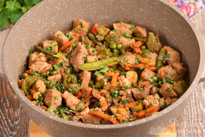 Это очень простое в приготовлении блюдо, а вкус получается замечательный. Еще оно мне нравится за то, что на подготовку уходит мало времени, его можно готовить с разным мясом, грибами, овощами и получать блюда с новыми вкусами. А еще блюдо можно готовить и на плите, и в духовке. Это не только простой, но и универсальный способ приготовления. Порции 5 Время подготовки 5 минут Время приготовления 40 минут Ингредиенты Инструкции 1. Мякоть свинины нарезаем на средние кусочки, выкладываем в высокую сковороду или жаровню, как у меня. Накрываем крышкой и готовим на среднем огне, помешивая, около 20 минут. Можно готовить из любого мяса, будет разное время приготовления. 2. В процессе приготовления добавляем смесь перцев (дает отличный вкус и легкую остроту). Кусочки свинины должны немного зарумяниться. 3. Отправляем в мясо нарезанный на полукольца лук и мелко нарезанный чеснок. Обжариваем 2 минуты, помешивая. 4. Для приготовления подходит любая овощная замороженная смесь по вкусу. У меня Кари