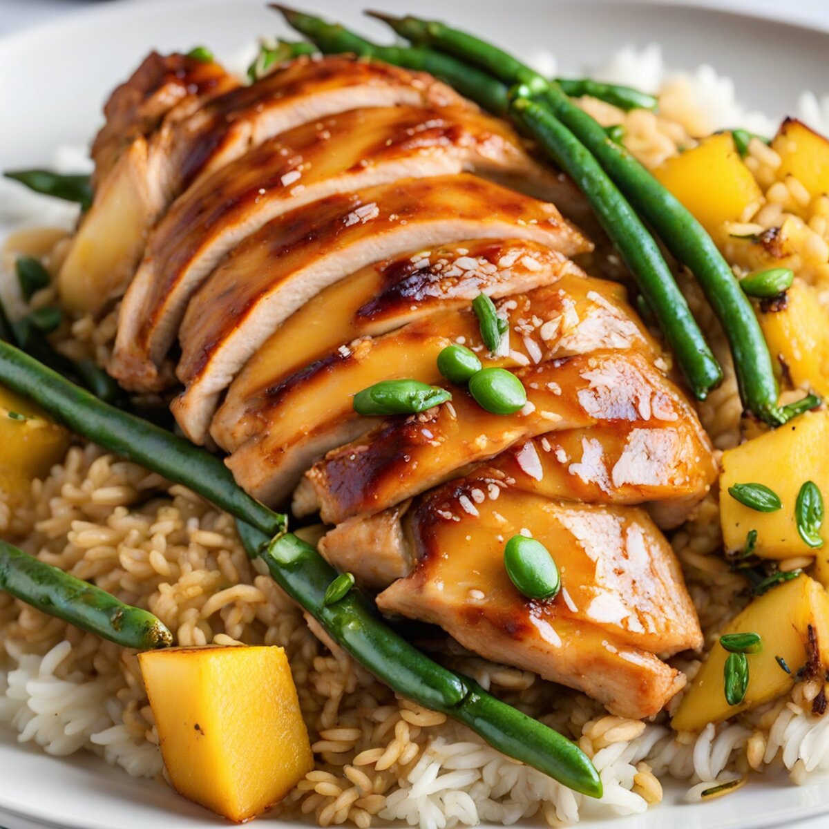 Sweet and Spicy Pineapple Glazed Turkey with Stir-Fried Green Beans and Coconut Rice