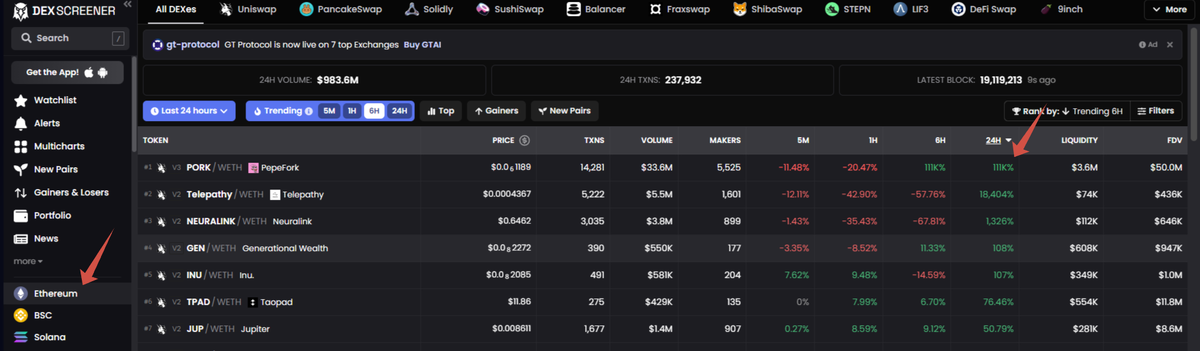 Анализ крипто кошелька - это процесс исследования и изучения транзакций и баланса криптовалютного кошелька. Давайте для начала найдем какой то интересный кошелек инсайдера и постараемся сделать анализ его кошелька. 1. Идем на сайт https://dexscreener.com/ethereum и ищем самый растущий токен на сегодня. Важно чтобы была хорошая ликвидность. В нашем примере это будет токен PORK который вырос на 114 тысяч % за сутки с ликвидностью 3.6 млн. 2. Далее мы идем на сайт arbitragescanner. Регистрируйтесь и выбирайте тариф от Бизнес и выше. Так вы попадете в закрытый чат коммюнити + у вас будет личный менеджер. Оплатить можно картой или криптой, как вам удобно 3. Далее выбираем раздел Анализ кошельков -> Поиск кошельков по фильтрам 4. Сейчас мы найдем кошельки инсайдеров, которые заработали на токене PORK. Переходим снова на Dexscreener и находим справа смарт контракты ( указал стрелочками которые нас интересуют ) 5. В раздел покупаемый токен мы вставляем смарт контракт PORK ( тот что выше ). В