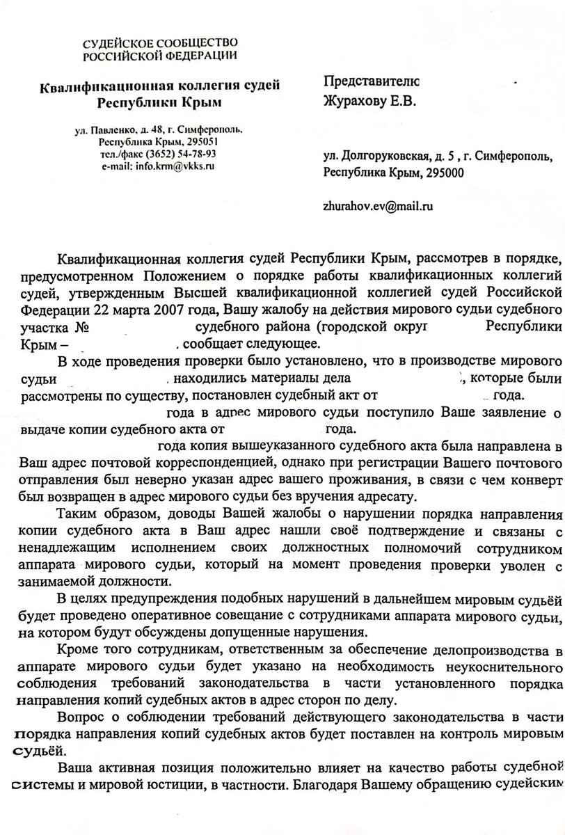Система не всегда гарантирует предусмотренный результат. Краткая история по данному поводу: Прошло очередное судебное заседание с положительным для нас решением. Осталось лишь дождаться получения копии решения суда. Однако, неожиданно для нас сей процесс занял приблизительно 6 месяцев. Проблема заключалась в халатном отношении аппарата судьи. Копию решения отправили по некорректному адресу. По итогу оно вернулось обратно. Написав несколько обращений с просьбой предоставить нам копию решения по делу мы не получили ответа. По итогу было принято решение обратиться в Квалификационную коллегию судей с жалобой на действия сотрудника аппарата судьи по нашему делу. Результат приятно удивил. Квалификационная коллегия провела разъяснительную беседу с аппаратом судьи, и как результат копию решения мы получили в короткие сроки. Ниже предоставляем Вам ответ Квалификационной коллегии: Если у Вас имеется схожая проблема и вы не знаете как ее решить - обращайтесь к нам! Мы с моей командой с радостью