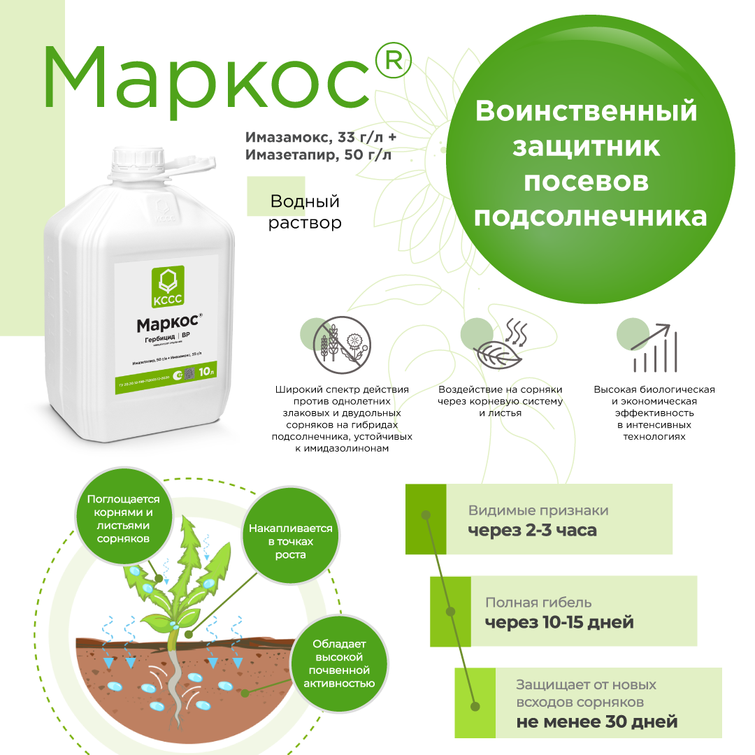 Зарегистрирован новый гербицид для уничтожения широкого спектра сорняков на подсолнечнике — Маркос, ВР (имазамокс, 33 г/л + имазетапир, 50 г/л).