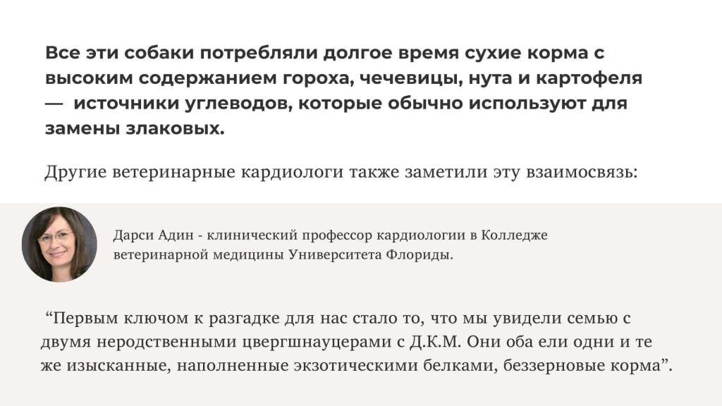 Эта история началась в 2018 году, когда Центр ветеринарной медицины Управления по санитарному НАДЗОРУ за качеством пищевых продуктов и медикаментов США и сеть ветеринарных исследовательских лабораторий начали изучать потенциальную связь между сообщениями о дилатационной кардиомиопатии (DCM) у собак и употреблением кормов, в которых пшеничный глютен заменяли такими продуктами как: горох, чечевица, картофель...