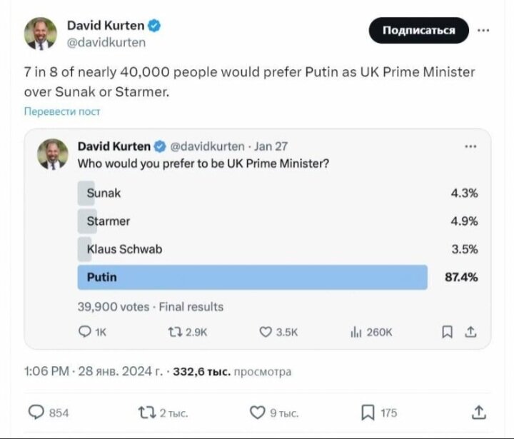 Во время проведения голосования в социальных сетях, член британской партии «Наследие» Дэвид Куртен создан настоящую сенсацию в британских СМИ. Похоже, что британцы хотят видеть Владимира Путина в роли премьер-министра Британии, так как более 87% участников опроса отдали свои голоса в его пользу. Однако же, ответы на этот опрос не являются простыми проявлениями симпатии к российскому лидеру. В комментариях под опросом поклонники Куртена пишут, что Москва не является врагом Британии, но если Лондон продолжит настаивать на своих взглядах, у России не останется иного выбора кроме как открытое противостояние. Оказывается, это не первый раз, когда Куртен выступает в поддержку России. Ранее он опубликовал в социальной сети российский флаг и призвал не враждовать с нашей страной. Вскоре после этого, местная пресса начала распространять информацию о том, что британцам следует готовиться к вооруженному конфликту с Россией в ближайшие годы. Очевидно, что Куртен не согласен с этим мнением и катего
