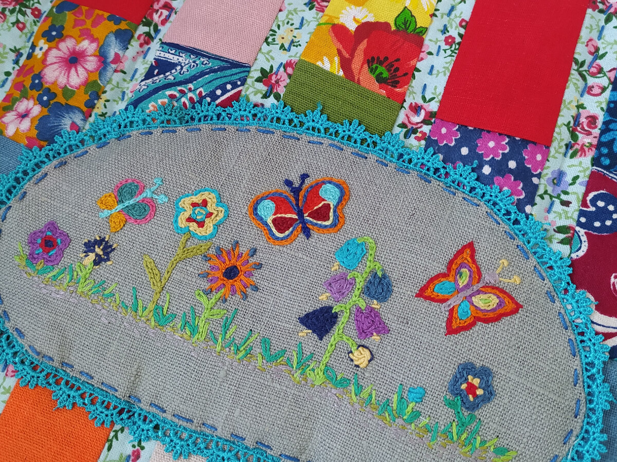 Огромный секрет маленького одеяльца раскрою чуть ниже, а пока украшение "лица" - про вышивку. Цветущая полянка появилась давненько и просто лежала у меня в сундуке с подобными богатствами, поджидая своего звёздного часа. И вот дождалась, одеяльце красуется на выставке, о которой расскажу отдельно.