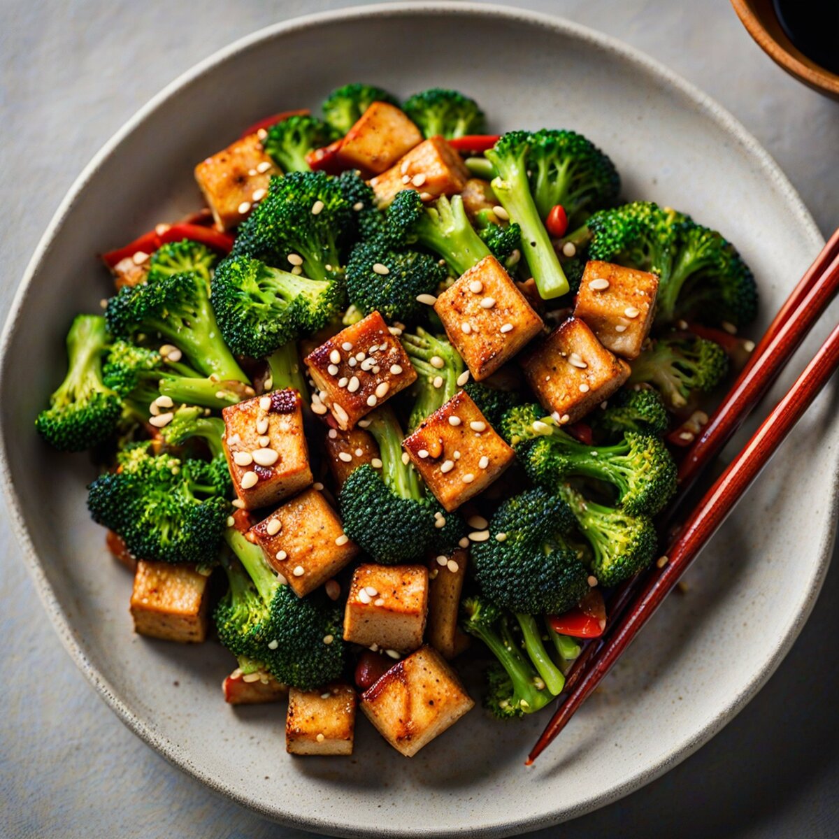 Delicious and flavorful, this Spicy Tofu Stir-Fry with Sesame Broccoli is a vibrant and satisfying vegetarian dish with a perfect balance of heat and.. INGREDIENTS: 4 Servings 14 ingredients. DIRECTIONS: 7 steps. Ready in about 35 minutes. 1. In a large skillet or wok, heat 1 tbsp of sesame oil over medium-high heat. 2. Add the tofu cubes and cook until golden brown on all sides. Remove from skillet and set aside. 3. In the same skillet, add the remaining 1 tbsp of sesame oil and sauté the garlic and ginger for 1 minute. 4. Add the broccoli, snap peas, and bell pepper, and stir-fry for 3-4 minutes until vegetables are tender-crisp. 5. In a small bowl, mix together the soy sauce, hoisin sauce, sriracha, and vegetable broth. Pour the sauce over the vegetables and toss to coat. 6. Add the cooked tofu back to the skillet and stir to combine. Cook for 2-3 minutes until heated through. 7. Top the stir-fry with chopped green onions and peanuts. Serve over cooked rice. Enjoy!