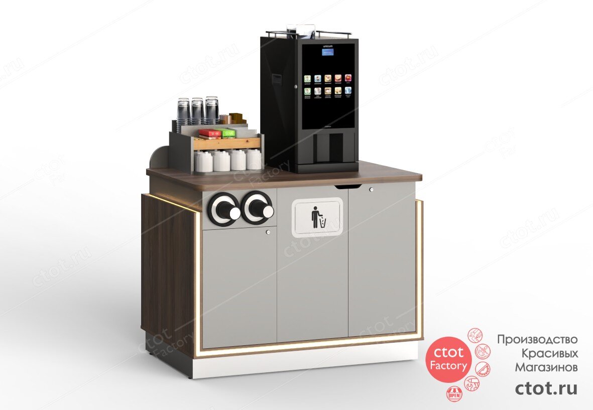 Привет, друзья! Желаем отличного вторника и представляем вам очередную недавнюю разработку - кофе-модуль для офиса, который привлекает своим стилем и красотой! Серый корпус и темное дерево, украшенные многоцветной RGB подсветкой - вот что делает этот модуль настоящим воплощением элегантности. Но это еще не все! Кофе корнер обладает удивительной способностью создавать разнообразные световые эффекты, добавляя в рабочую обстановку долю волшебства и позитивной энергии.