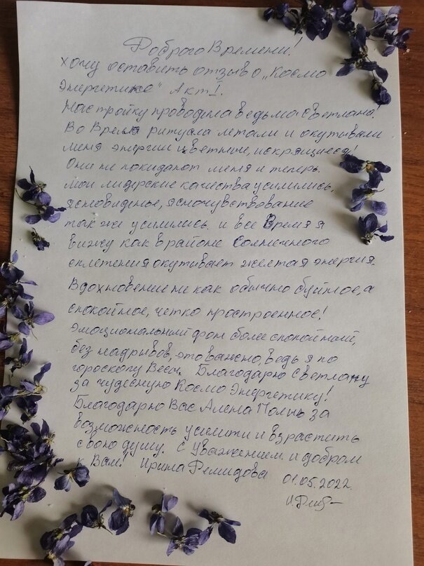 К нам поступил отзыв от Ирины, которая прошла Посвящение Космоэнергетика. В нем она делится своими впечатлениями, и благодарит Великую Ведьму Алену Полынь за возможность усилить свою Душу. Доброго Времени!