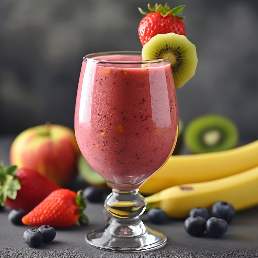 - Фруктовый смузи: смешайте в блендере любые любимые фрукты (бананы, яблоки, клубнику, чернику, манго, киви и т.д.), добавьте немного натурального йогурта и меда для сладости.