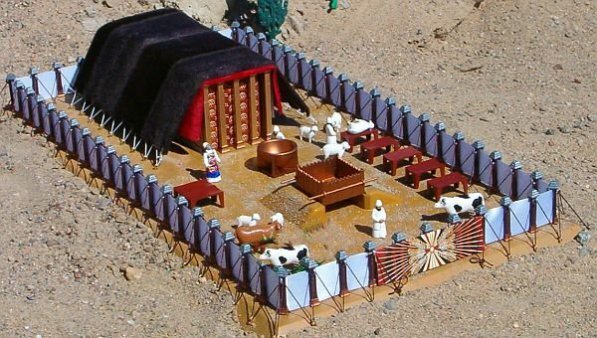 "И поставь в ней ковчег откровения, и закрой ковчег завесою; и внеси стол и расставь на нём все вещи его, и внеси светильник и поставь на нём лампады его; и поставь золотой жертвенник для курения перед ковчегом откровения, и повесь завесу у входа в скинию; и поставь жертвенник всесожжения перед входом в скинию собрания; и поставь умывальник между скинией собрания и между жертвенником, и влей в него воды; и поставь двор кругом, и повесь завесу в воротах двора" (Исх. 40:2–8).