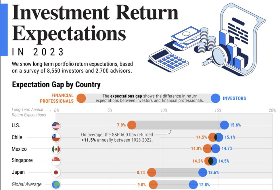 Был проведен очень интересный международный опрос среди инвесторов и инвестиционных консультантов, чтобы узнать какие у них ожидания, относительно будущей доходности долгосрочного инвестиционного портфеля. Результаты опроса приведены в таблице ниже: синим цветом обозначена доходность, которую ожидают инвесторы, а оранжевым доходность, которую прогнозировали профессионалы финансовой индустрии. Инвесторы, в основной своей массе думают, что получат доходность выше среднерыночной, а вот представители фин. индустрии настроены менее оптимистично. В данной ситуации, конечно, не столь важны получившиеся точные значения, здесь более любопытен разрыв между ожиданиями по доходности, особенно в США и глобально. Забавен и тот факт, что представители глобальной финансовой индустрии, в рамках объективного опроса/исследования, не пытаются завысить потенциальные доходности портфеля, как они это обычно делают перед новичками в инвестициях. Ведь они прекрасно знают, что все время обыгрывать рынок невозмо