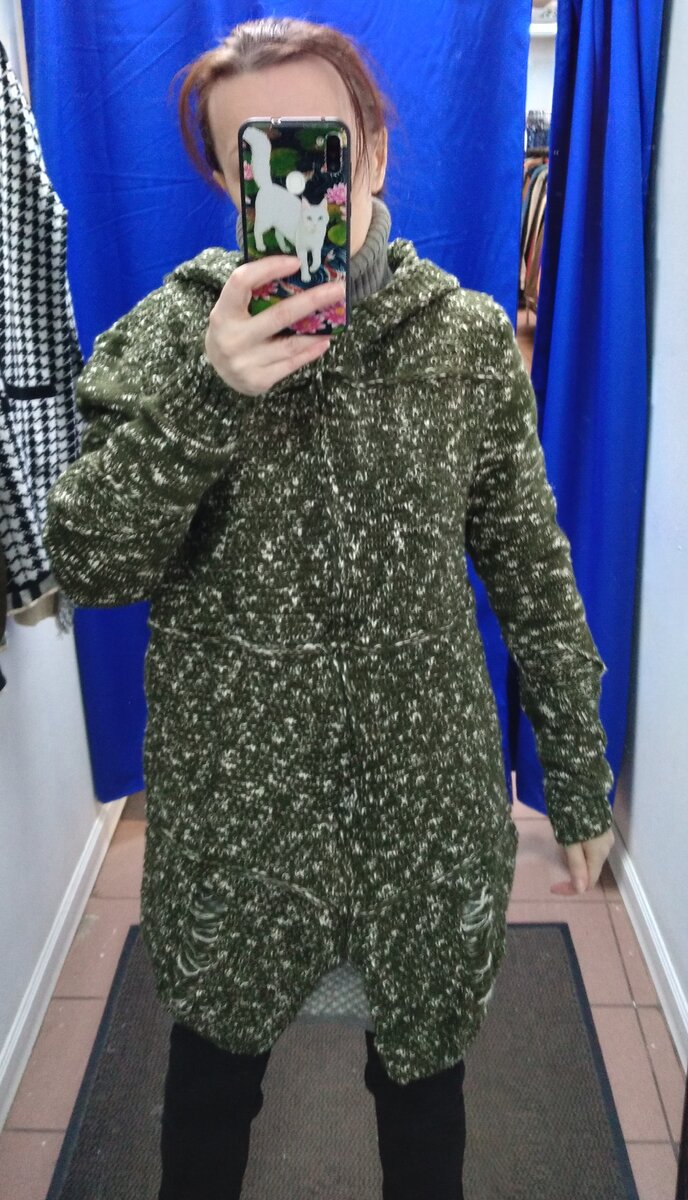 Не знаю можно ли это назвать кардиганом, скорее это пальто. Застегивается на молнию, есть большой капюшон и трикотажные манжеты на рукавах. Оказалось, что это мужская одежда, хотя я сказала бы, что абсолютный унисекс. И размерчик то совсем маленький.