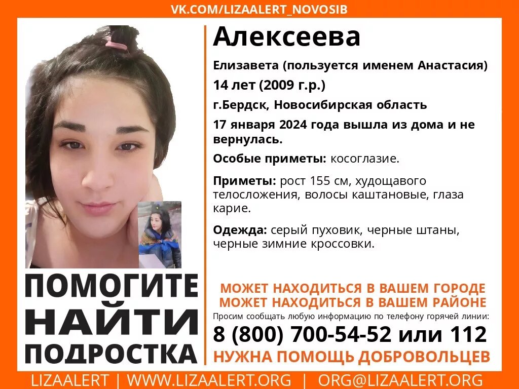 В Бердске Новосибирской области пропала 14-летняя Елизавета Алексеева, которая не возвращается домой и не выходит на связь с родными с 17 января 2023 года. Известно, что куда чаще Елизавета пользуется именем Анастасия, чем данным ей при рождении. «30 января, в поисково-спасательный отряд «ЛизаАлерт» Новосибирской области поступила заявка на поиск девочки 2009 года рождения. 17 января она не вернулась домой. Информационным координатором поиска поставлена задача для группы распространения информации по размещению ориентировки на пропавшую в сети и локальных чатах. Отряд ожидает получения актуальных свидетельств о возможном местонахождении девочки», — рассказала НДН.инфо представитель поисково-спасательного отряда «ЛизаАлерт» Ольга Бобкова. Приметы Елизаветы: рост 155 см, худощавое телосложение, каштановые волосы и карие глаза. Была одета: серый пуховик, черные штаны, черные зимние кроссовки. Всех, кто владеет информацией о местонахождении Сергея, просят позвонить по телефонам 112 или 8 8
