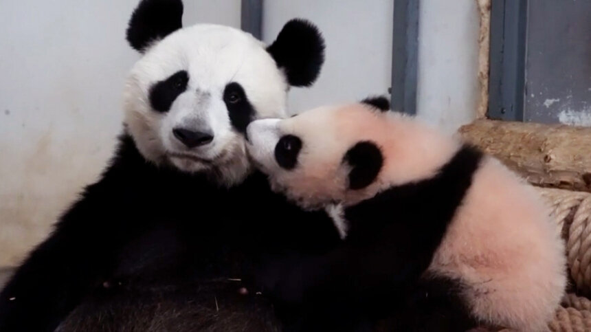 Панда Катюша учится играть с Пряней из «Шрека» и спит на маме — забавное видео