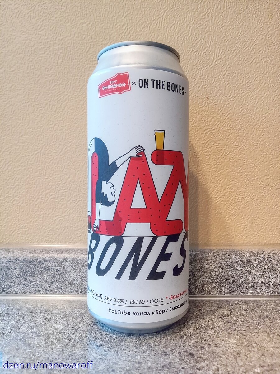 Сегодня будем дегустировать пиво под названием Lazybones (Бездельник), сваренное питерской пивоварней On The Bones Contract Brewery совместно сами знаете с кем. Пиво в стиле двойной весткост (такого я, вроде, еще не пробовал) было сварено в декабре прошлого года, а попробовал я его чуть больше, чем через месяц. Срок годности составляет 365 суток при хранении в холодильнике. Глянем описание: Коллаборация с сетью магазинов Беру Выходной, название которого отдает дань прокрастинации и лени (lazybones в одном из вариантов перевода с английского означает “бездельник”), рифмуется с пивоварней On the Bones и, в общем, воспевает тот момент, когда в голове раздается характерный щелчок: – Ладно, беру выходной! Оп, и рука уже протягивается к полке с банками DIPA. Охмеление Ahhhroma и Cryo Pop. Весьма хочется попробовать новомодный хмель Ahhhroma, но тут он идет в комплекте со смесью Cryo Pop, так что заценить его в чистом виде пока не получится. ТТХ: Пиво золотистое, прозрачное. Пены не особо мн