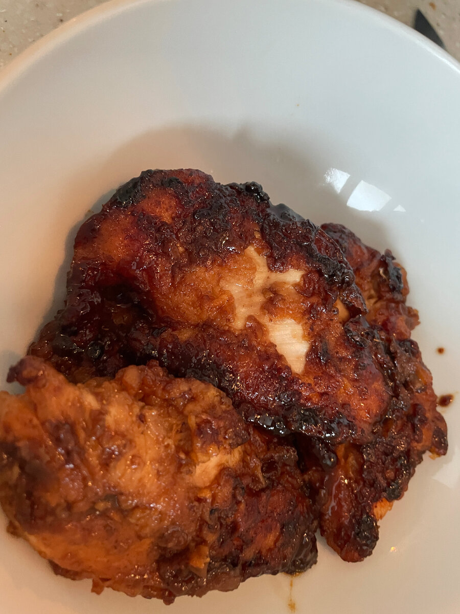 Обжаренную курицу откладываем на блюдо и на 1 минуту вливаем соус в сковороду. После минутного кипения марианада возвращаем в сковороду курицу.