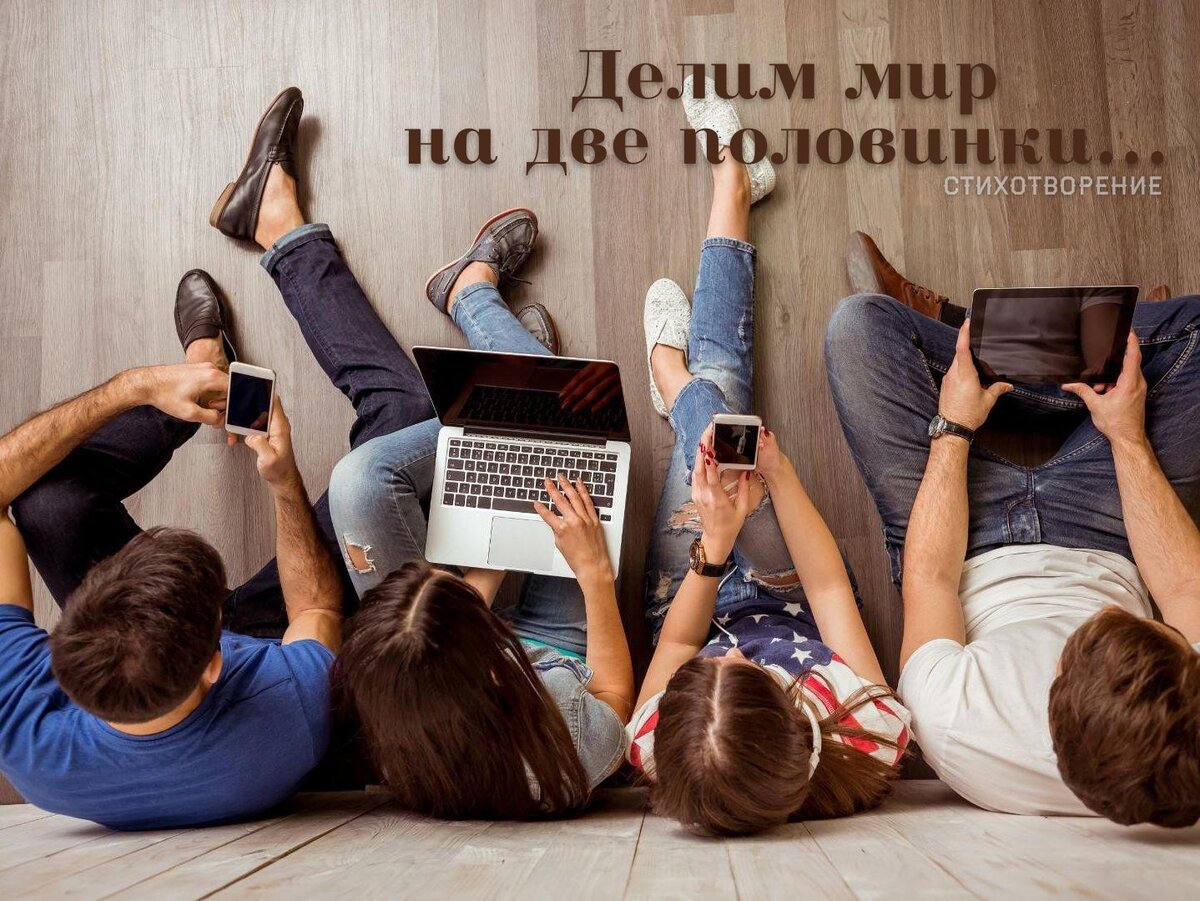 Увы, мы перешли в соцсети словно дети, Немыслим жизни нашей без своих смартфонов. Нас захватил всецело нереальный мир планшетов Мы забываем потихоньку жизнь иную, по другому. Всё сводится к светящему экрану, И наше здесь внимание пропадает А значит мы своими чувствами, желанием, Всё больше верим, то что на экране замирает. И так весь мир, на ровные пока две половинки. В одной реклама правит и красивые улыбки. В другой, всё больше видим мы изъяны и ошибки, И в той последней оставаться нет желаний...