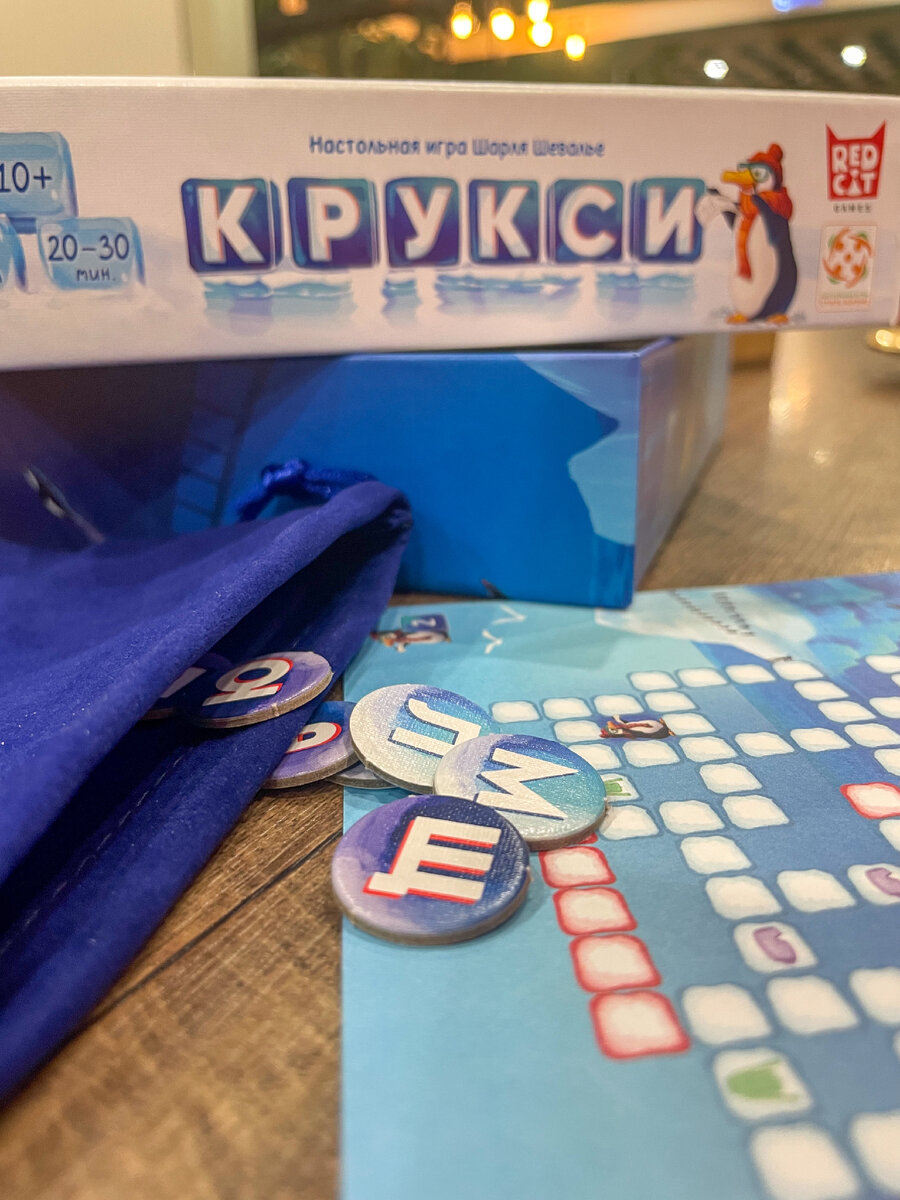 Всем «Крукси»! Продолжается тема пингвинов в моём блоге — сегодня расскажу про игру, где издатели заигрывают с механиками из «Эрудита» и Scrabble и делают это вполне успешно. Игра представляет собой смесь кроссворда и игры с буквами. В начале партии вы вытаскиваете буквы, которыми вы должны воспользоваться в раунде. Поначалу (на первых уровнях сложности) это будет 6 букв, дальше — больше. Вы вписываете два стартовых слова игры — и дальше по очереди дописываете слова в кроссворд, стараясь использовать как можно больше из выпавших вам букв. Чтобы победить, вам нужно вычеркнуть все клетки из ваших требований — но там не только буквы! Среди требований — ещё числа: вписать в кроссворд слово из 3, 4, 9 и так далее букв. А ещё — вписать слова в клетки с особыми символами (с нарисованными элементами одежды). То есть ваша задача — задействовать максимально заданные буквы, придумывать слова с определённым числом букв, а ещё пытаться делать это в местах, где есть особые символы. Задачка, в общем