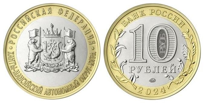 Банк России решил обновить ряд юбилейных биметаллических десятирублевок серии «Российская Федерация». На этот раз новую монету посвятили Югре. 10 рублей «Ханты-Мансийский автономный округ — Югра» Монета круглая, комбинированная, ее диаметр 27 мм, тираж 1 миллион штук. Все надписи и дата соответствуют номиналу. В нижней части диска расположен товарный знак Московского монетного двора. На оборотной стороне монеты расположено рельефное изображение герба Ханты-Мансийского автономного округа — Югры; на кольце по окружности имеются надписи, разделенные точками: в верхней части «РОССИЙСКАЯ ФЕДЕРАЦИЯ», в нижней части «ХАНТЫ-МАНСИЙСКИЙ АВТОНОМНЫЙ ОКРУГ — ЮГРА». Ханты-Мансийский автономный округ — Югра Это субъект Российской Федерации на Крайнем Севере. Территориально является частью Тюменской области. Площадь Югры равна площади Франции. Проживает в регионе около 1,5 млн человек, из которых всего 32 тысячи — это представители малых народностей: ханты, манси и ненцы. Лишь половина из них ведет тр