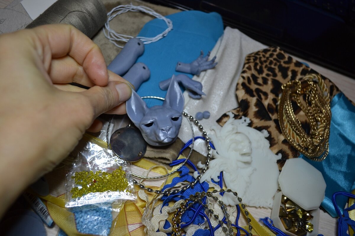 - Распечатанный комплект деталей кота из фотополимерной смолы серого цвета (голова с отдельными глазами под роспись, передние когтистые лапы, задние антропоморфные кошачьи лапы),